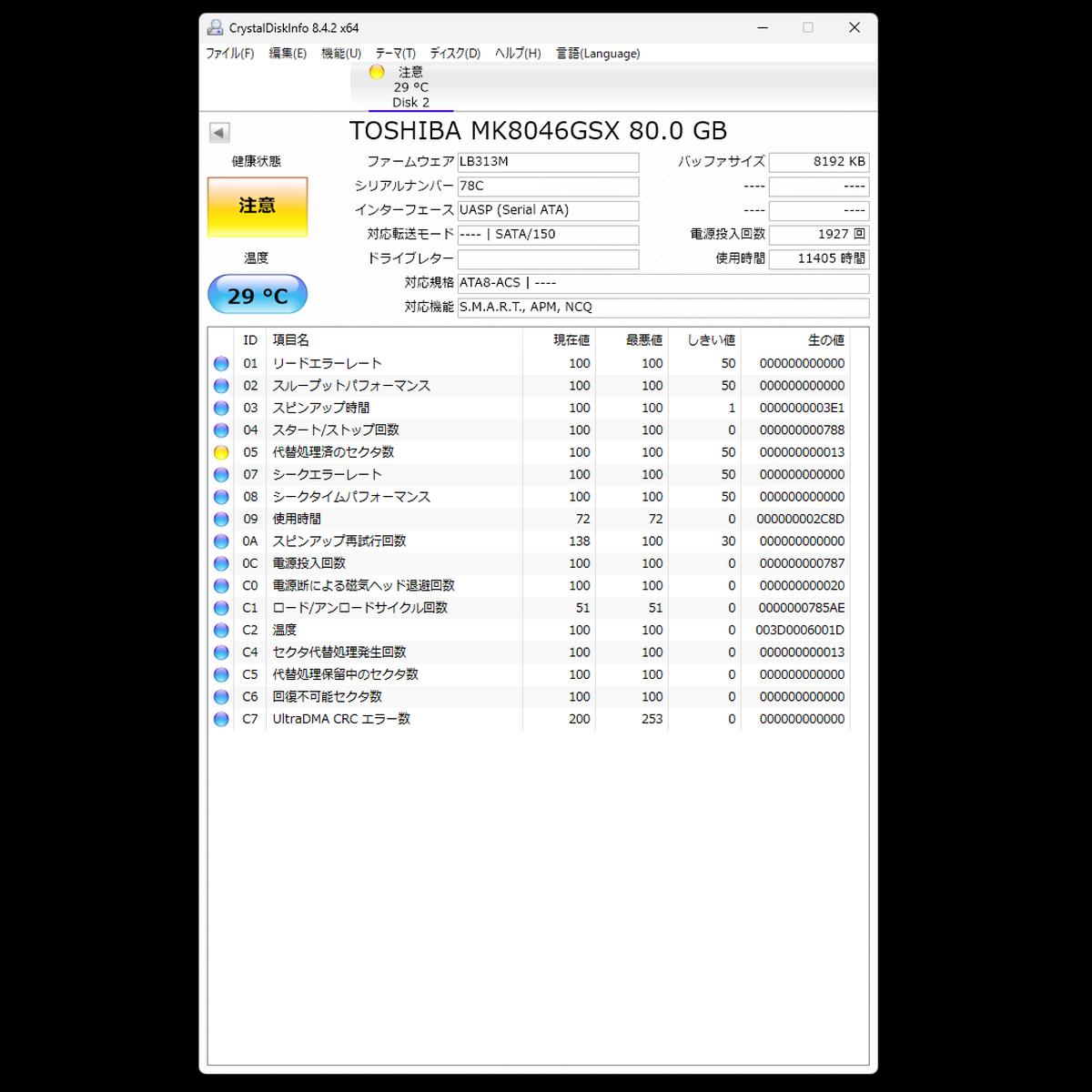 USB変換アダプタを使用している為、CrystalDiskInfoの情報の正確性まではわかりかねます。