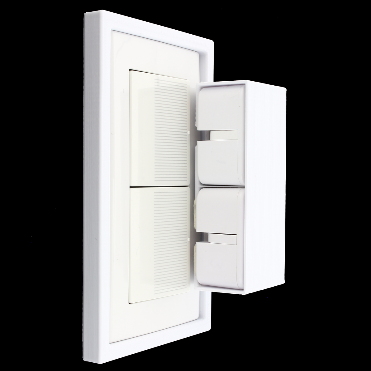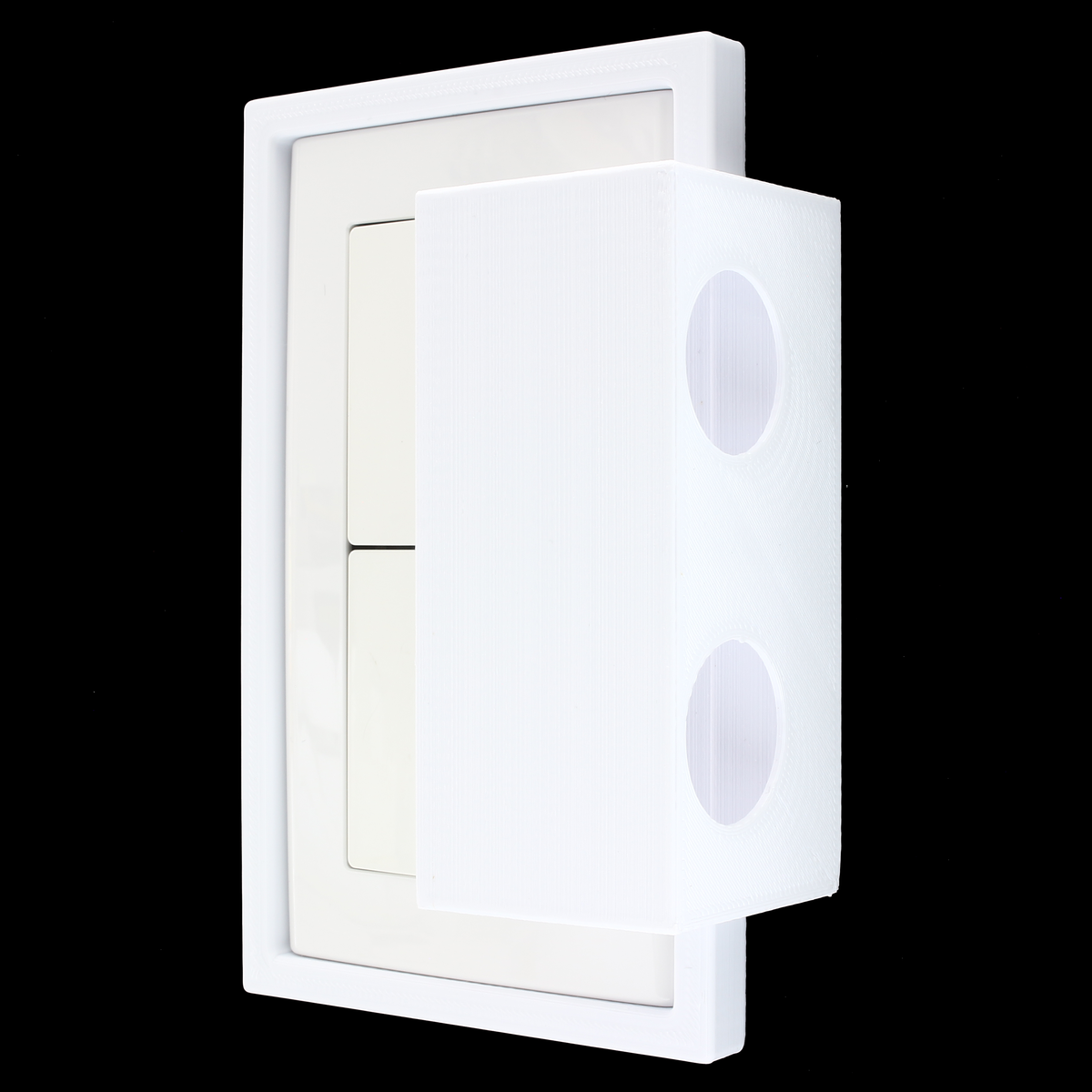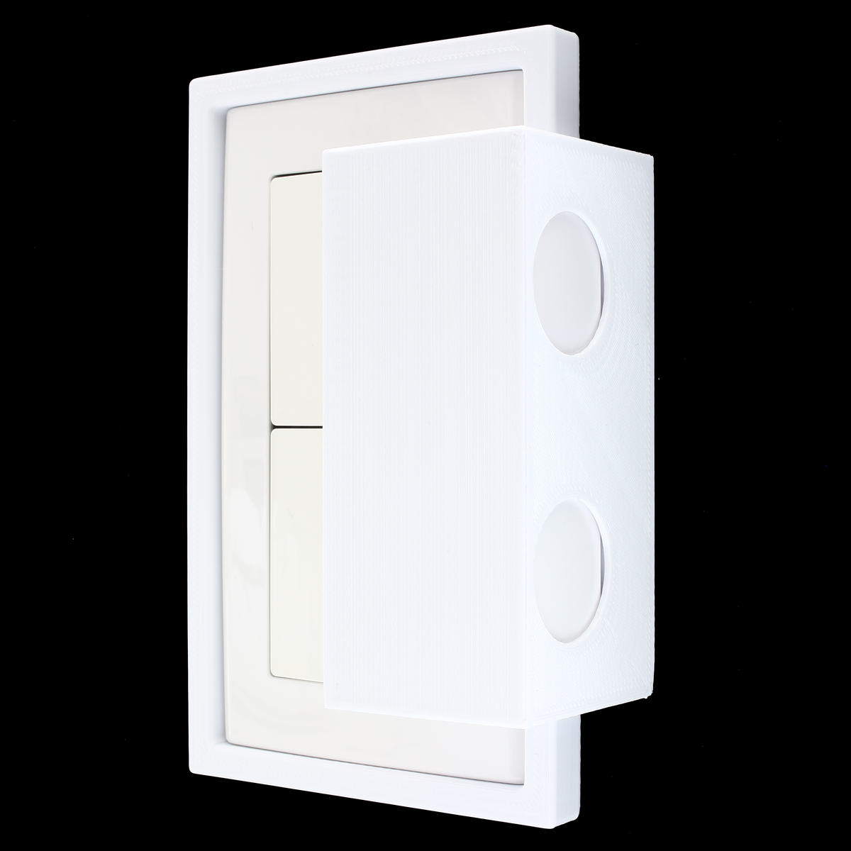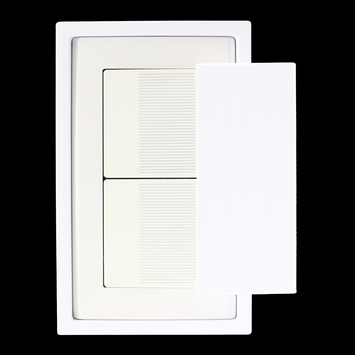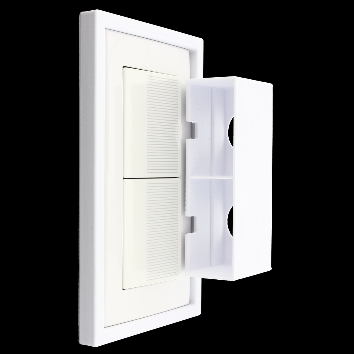 SwitchFrameはソケット部分と壁のスイッチカバーに取り付ける枠部分から成り、接着剤で固定し一体化しております。