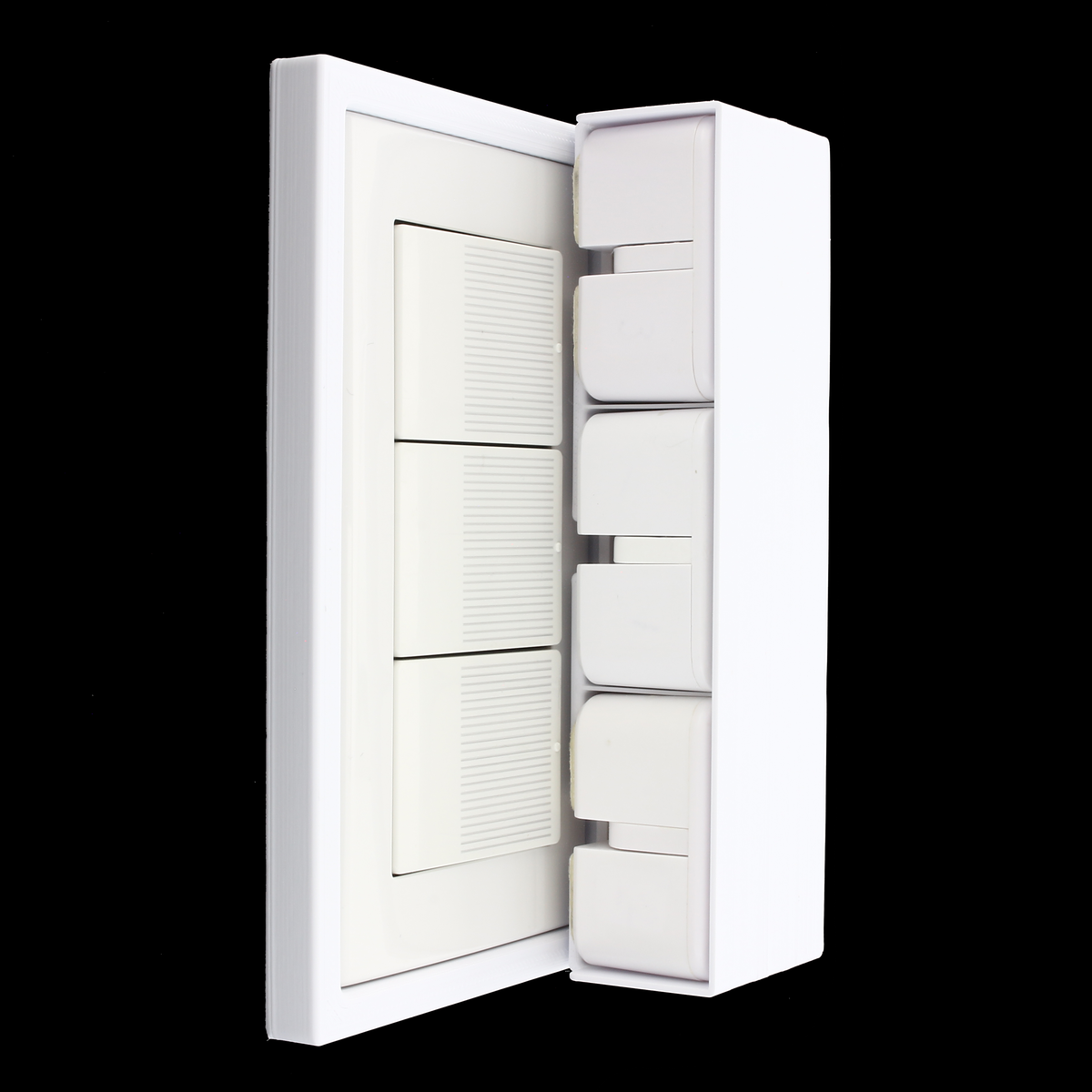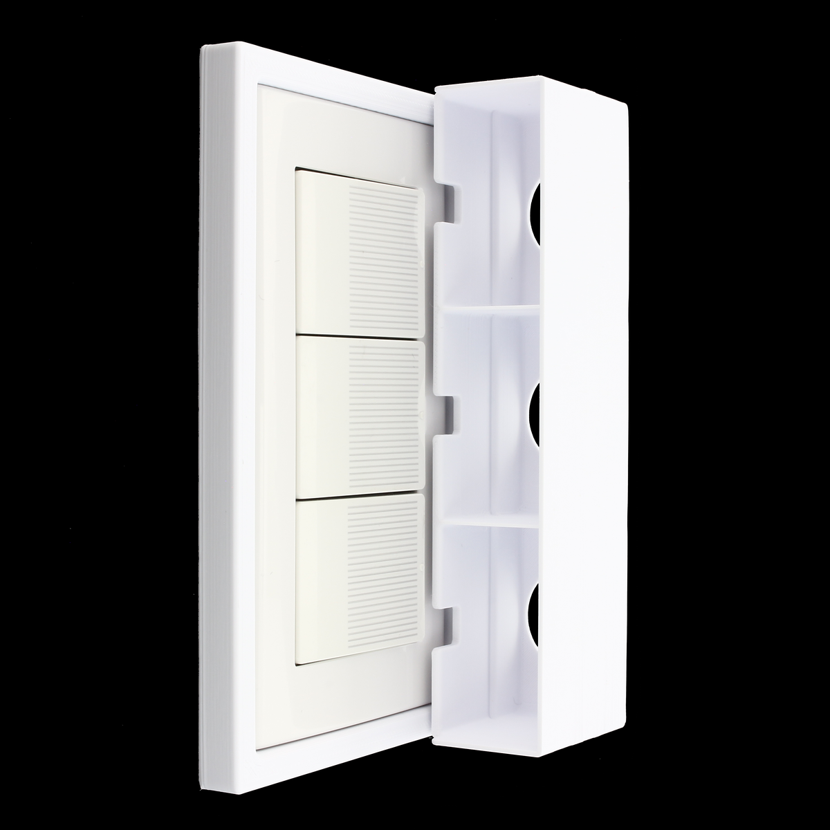 SwitchFrameはソケット部分と壁のスイッチカバーに取り付ける枠部分から成り、接着剤で固定し一体化しております。