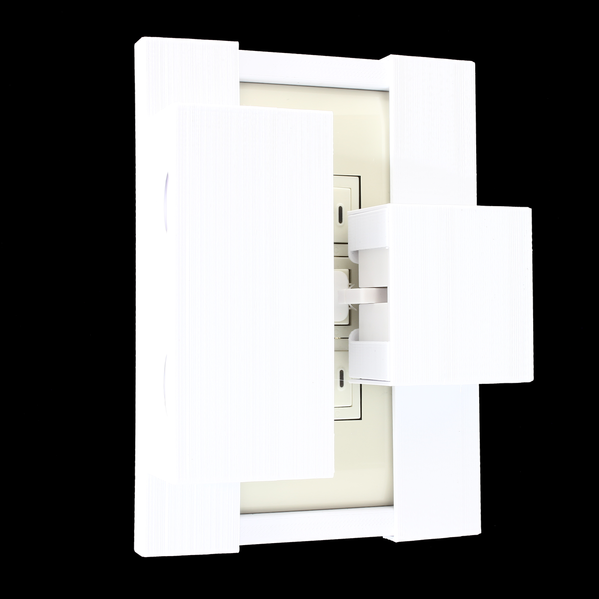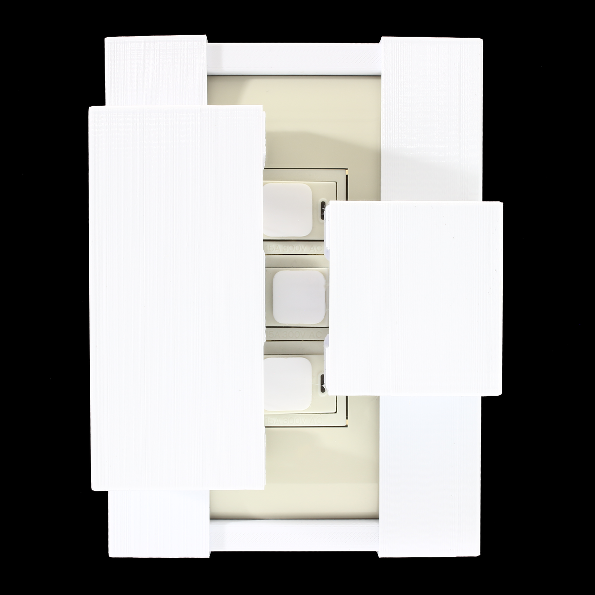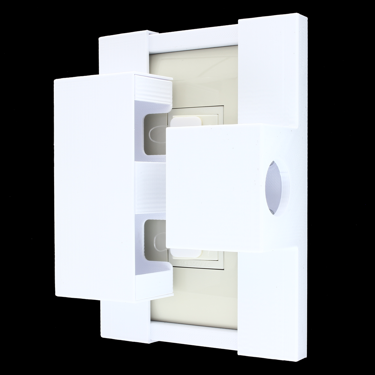 SwitchFrameはソケット部分と壁のスイッチカバーに取り付ける枠部分から成り、接着剤で固定し一体化しております。